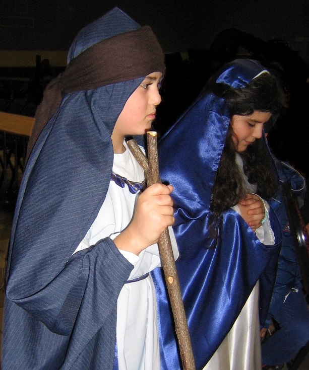 The children are running around like crazy while mothers sort through white robes and gold-tinsel halos to dress the choir of angels. Ayfer, the director of the Christmas play, is showing Mary how to knee, stand up and walk backwards without tripping over her blue veil. Somebody has decided to give the boys who are playing the shepherds each a long stick as shepherds’ hooks. This is a bad idea. Four boys waiting around to be scared by an angel plus four long sticks only mean trouble. They are twirling and jabbing and thrusting the sticks at each other. I go over and tell them (in basic and bad German) that the sticks are not toys. They calm down for about two minutes and then jump up again.