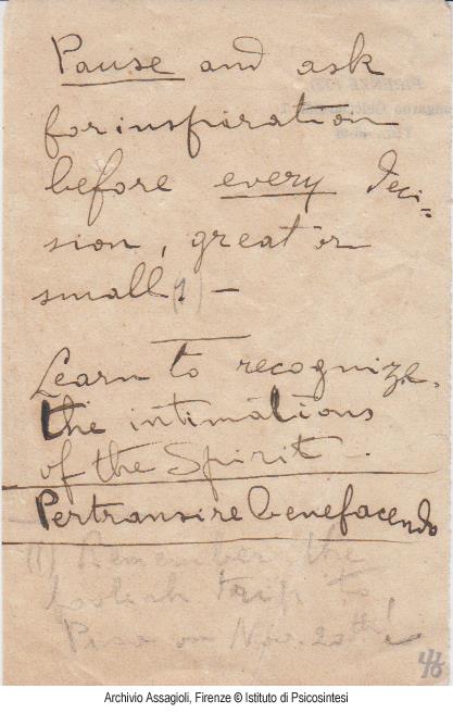 Pause and ask for inspiration before every decision, great or small. (1) Learn to recognize the intimations of the Spirit. Pertransire benefacendo. (Go around doing good for others.) (1) Remember the foolish trip to Pisa on Nov 20th! (Note from Assagioli’s archives.)