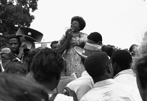 FILE – In this Sept. 17, 1965 file photo, Fannie Lou Hamer, of Ruleville, Miss., speaks to Mississippi Freedom Democratic Party sympathizers outside the Capitol in Washington after the House of Representatives rejected a challenger to the 1964 election of five Mississippi representatives. (AP Photo/William J. Smith, File)