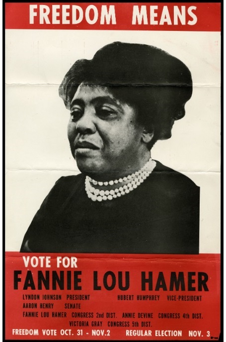 Once the owner of the farm where she worked learned that she had tried to register to vote (which was initially denied because of a trumped up ‘literacy test’), she was immediately fired. Despite having to move house, loose most of her possessions, and ultimately flee for her life, Hamer was free to pursue her calling. Reflecting later, she said “They kicked me off the plantation, they set me free. It’s the best thing that could happen. Now I can work for my people.”