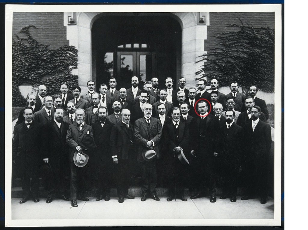 Meeting in of psychoanalysts (undated). Jung is circled and Freud is to his right. Assagioli is not present. Front row, left to right: Franz Boas, E.B. Titchener, William James, William Stern, Leo Burgerstein, G. Stanley Hall, Sigmund Freud, Carl G. Jung, Adolf Meyer, H.S. Jennings. Second row: C.E. Seashore, Joseph Jastrow, J. McK. Cattell, E.F. Buchner, E. Katzenellenbogen, Ernest Jones, A.A. Brill, Wm. H. Burnham, A.F. Chamberlain. Third row: Albert Schinz, J.A. Magni, B.T. Baldwin, F. Lyman Wells, G.M. Forbes, E.A. Kirkpatrick, Sandor Ferenczi, E.C. Sanford, J.P. Porter, Sakyo Kanda, Hikoso Kaksie. Fourth row: G.E. Dawson, S.P. Hayes, E.B. Holt, C.S. Berry, G.M. Whipple, Frank Drew, J.W. A. Young, L.N. Wilson, K.J. Karlson, H.H. Goddard, H.I. Klopp, S.C. Fuller